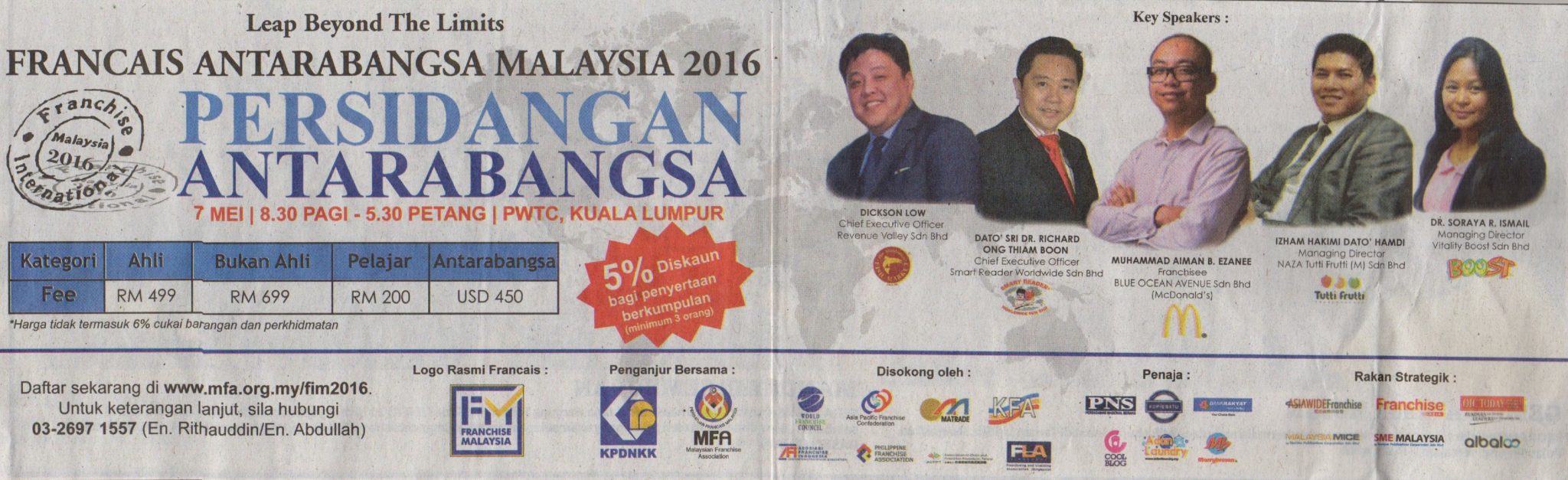 Berita Harian – 10 Mei 2016 MENTERI Perdagangan Dalam Negeri, Koperasi dan Kepenggunaan Datuk Seri Hamzah Zainudin (dua dari kanan) ketika membuat tinjauan mesra ke Pameran Francais Antarabangsa Malaysia di PWTC. – Foto Muhd Asyraf Sawal KUALA LUMPUR: Kementerian Perdagangan, Koperasi dan Kepenggunaan (KPDNKK) menyasarkan kira-kira 10,000 produk tempatan di jual di pasar…