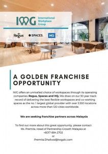 IWG plc was created in 2016 for different flexible workspace companies and is listed on the London Stock Exchange (LSE: IWG). They have more 10,000 team members globally with 3,300+ locations in 1,000+ towns and cities across 110+ countries.bbbbbb They are seeking for franchise partners across Malaysia. For more info on this great opportunity, please…