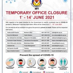With regards to the latest directive by the Government to restrict movement due to COVID-19 pandemic, Malaysian Franchise Association (MFA) office will be close from 1st – 14th June 2021 . . Our secretariat will be available throughout the period by phone or email as per below. Meanwhile, do join MFA Official Telegram Channel to…
