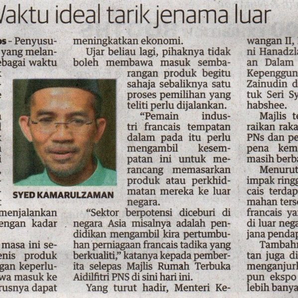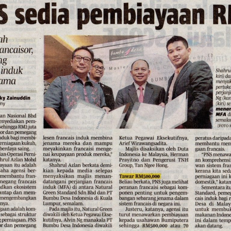 9 September 2015 – Utusan Online KUALA LUMPUR 8 Sept. – Perbadanan Nasional Berhad (PNS) dan Persatuan Francais Malaysia (MFA) komited mengukuhkan industri francais negara melalui pembangunan modal insan dalam kalangan usahawan francais. Pengerusi PNS Datuk Seri Syed Ali AlHabshee berkata, MFA akan memainkan peranannya dengan memantau prestasi ahli persatuan lebih kerap dan menyeluruh untuk…