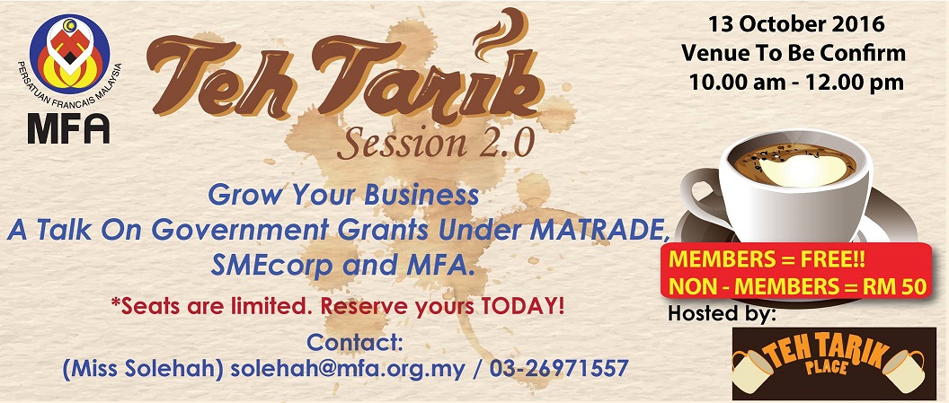 As a part of our continuous effort in serving our members, Malaysian Franchise Association (MFA) is bringing back the “Teh Tarik Session Vol 2/2016”. We are pleased to inform that Malaysian Franchise Association (MFA) will be organizing a Teh Tarik Session with topic Grow Your Business: A Talk on Government Grants under MATRADE, SMEcorp and MFA’. For your information, previous year we have organized four (4) Teh Tarik Sessions that were held in various members’ outlet. We have received a positive feedback and comment from other members joined this session.