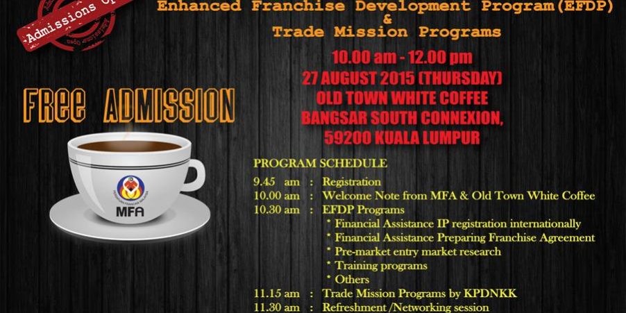 The “Teh Tarik Session” will be on 27th August 2015 (Thursday). Through this discussion, we will highlight some topics which are Trade Mission Programs available by KPDNKK and Enhanced Franchise Development Program (EFDP). EFDP is an enhancement program for the existing Franchise Development Program (FDP). The prime focus of EFDP will be on to nurture and encourage more franchise exports to foreign countries. During the 2015 Budget speech, the Prime Minister Y.A.B. Dato’ Sri Mohd. Najib Tun Abdul Razak, announced a RM20 million budget allocation for Franchise Development Scheme or EFDP to be implemented by MDTCC and MFA. Under this program, the allocation will focus on financial assistance on Intellectual Property (IP) registration and Franchise Agreement, pre-market entry market research, training programs and other types of assistance.