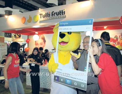 PENGUNJUNG bergambar bersama maskot Tutti Frutti yang turut serta dalam FIM 2014 di Pusat Perdagangan Dunia Putra, Kuala Lumpur, semalam.