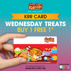 DetailsGood news for KRR Card members ! With #KRRCard, you now can enjoy Buy 1 FREE* 1 on every Wednesday. Mark your calendar now! #WednesdayTreats Not yet a member? Get one from KRR restaurant at minimum initial load of RM100 value. Info at https://card.krr.com.my/