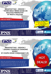 Perbadanan Nasional Berhad (PNS) will be organising a breakfast talk session focusing on the “Future Mega Trends Based On Malaysia Perspective” by Frost & Sullivan and “Leading Change in Changing World” by Chapel House Consultancy Ltd. Details as below:- Date: Tuesday/16th August 2016 Time: 9.00 a.m till 1.00 p.m Venue: Tun Rahah, Auditorium Level 1,…