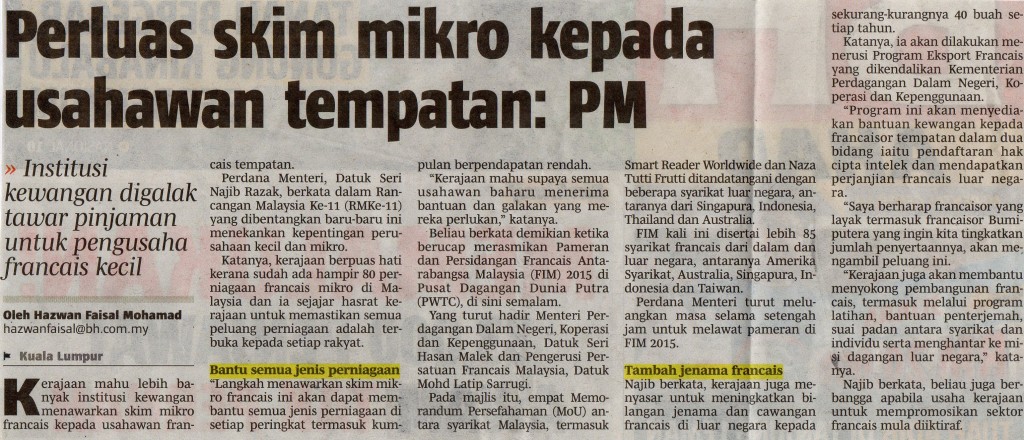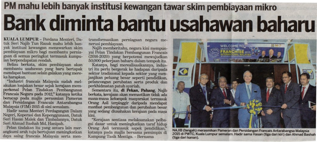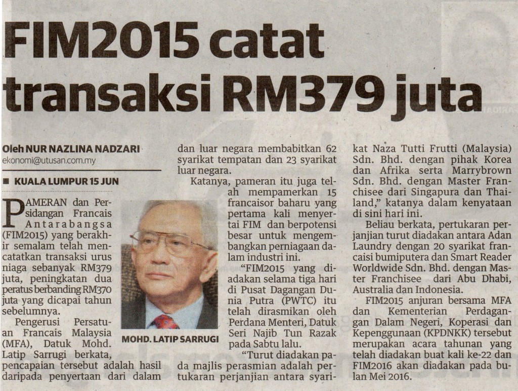 KUALA LUMPUR 15 Jun – Pameran dan Persidangan Francais Antarabangsa (FIM2015) yang berakhir semalam telah mencatatkan transaksi urus niaga sebanyak RM379 juta, peningkatan dua peratus berbanding RM370 juta yang dicapai tahun sebelumnya. Mohd. Latip Sarrugi Pengerusi Persatuan Francais Malaysia (MFA), Datuk Mohd. Latip Sarrugi berkata, pencapaian tersebut adalah hasil daripada penyertaan dari dalam dan luar…