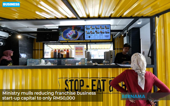 The Ministry of Domestic Trade and Consumer Affairs is considering a proposal to reduce the start-up capital of franchise business to only RM50,000 to facilitate micro-entrepreneurs, especially those who are keen to venture into the franchise sector.
