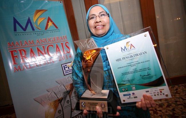Ketua Pengarah Perbadanan Harta Intelek Malaysia, Shamsiah Kamaruddin menunjukkan trofi Anugerah Khas yang dimenangi pada Malam Anugerah Francais Malaysia 2014 di Kuala Lumpur, semalam. – Utusan/SHIDDIEQIIN ZON