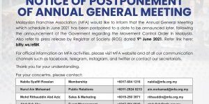 Malaysian Franchise Association (MFA) would like to inform that the Annual General Meeting which schedule in June 2021 has been postponed to a date to be announced later, following the announcement of the Government regarding the Movement Control Order in Malaysia. Also refer to press by Registrar of Society (ROS) dated 9th June 2021. Refer link HERE