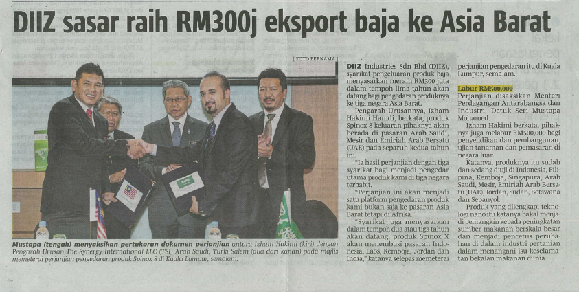DIIZ Industries Sdn Bhd (DIIZ), syarikat pengeluaran produk baja menyasarkan meraih RM300 juta dalam tempoh lima tahun akan datang bagi pengedaran produknya ke tiga negara Asia Barat.