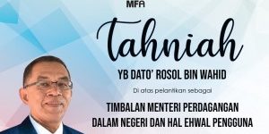 MFA mengucapkan tahniah kepada YB Dato’ Rosol Bin Wahid di atas perlantikan beliau sebagai Timbalan Menteri Kementerian Perdagangan Dalam Negeri dan Hal Ehwal Pengguna (KPDNHEP) yang baharu.
