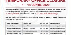 With regards to the latest directive by the Government to restrict movement due to COVID-19 pandemic, Malaysian Franchise Association (MFA) office closure will be extend till 12th May 2020. We will resume work on 13th May 2020 (Wednesday)