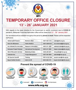 With regards to the latest directive by the Government to restrict movement due to COVID-19 pandemic, Malaysian Franchise Association (MFA) office will be close from 13th – 26th January 2021 .